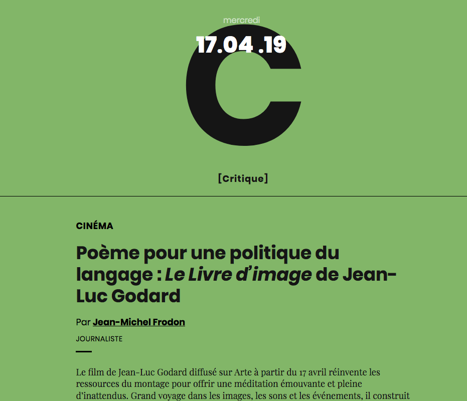 On devrait mais on ne peut pas. On devrait regarder-écouter cela comme si n’existait pas cette jungle qui prospère depuis 60 ans autour du nom « Godard ». Il faudrait aller regarder son ordinateur ou sa télé, à partir du 17 avril , et laisser venir. Bien entendu l’auteur de ses lignes n’est pas plus qu’un autre dans cet état d’innocence impossible. Mais on peut y jouer — pas seulement pour le plaisir de jouer, qui est bien légitime, ni pour se défaire du fardeau culturel, médiatique et plein d’autres choses encore qui pèsent, obscurcissent, brouillent et épuisent, mais pour reconstruire la possibilité d’une rencontre. Que rencontrerait-on alors, sous l’intitulé Le Livre d’image ?