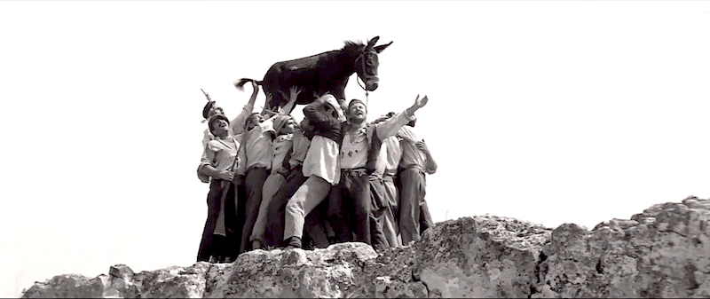 Dans un noir et blanc somptueux, il mobilise la puissance graphique des paysages aussi bien que l’intensité des présences physiques de la bande de villageois exaltés, s’amuse et s’étonne de la présence simultanément abstraite et sensuelle de l’énorme forme à la fois animale, sexuelle, magique et réaliste qui circule au-dessus d’eux.