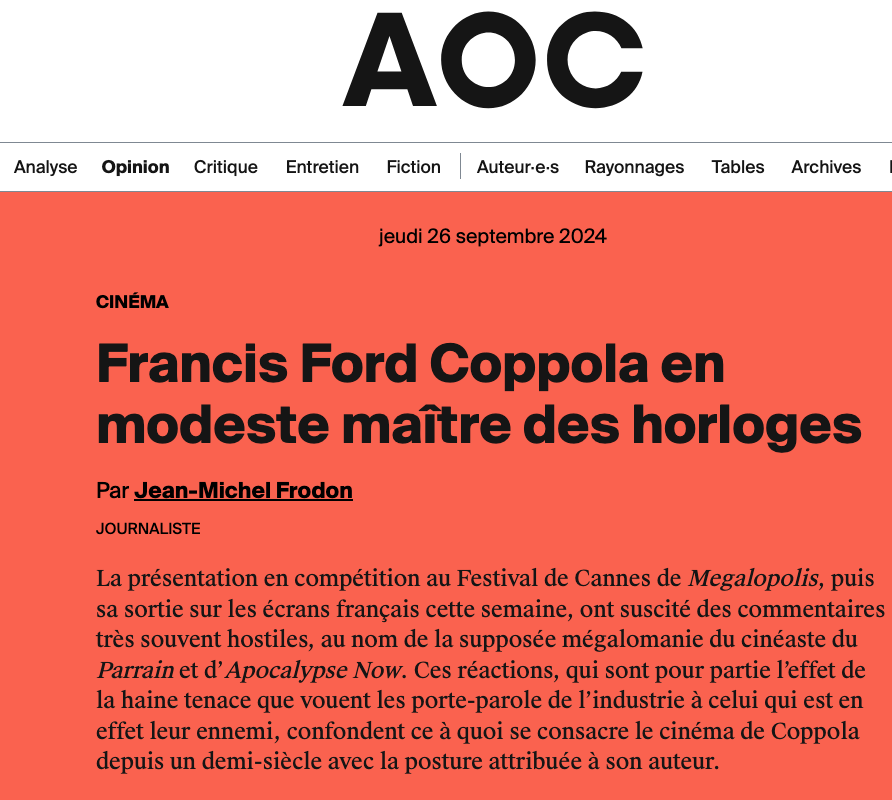 Dans un récent entretien aux Cahiers du cinéma (n° 812, septembre 2024), Coppola dit : « Le temps est le sujet de mon film. » Il ne faut jamais prendre au pied de la lettre ce qu’il dit de ses films. Il vaudrait mieux reformuler son affirmation en « le temps est l’objet – ou un des objets principaux – de mon film ». Mais comme il l’a été, de multiples manières, à travers la quasi-totalité de son œuvre.