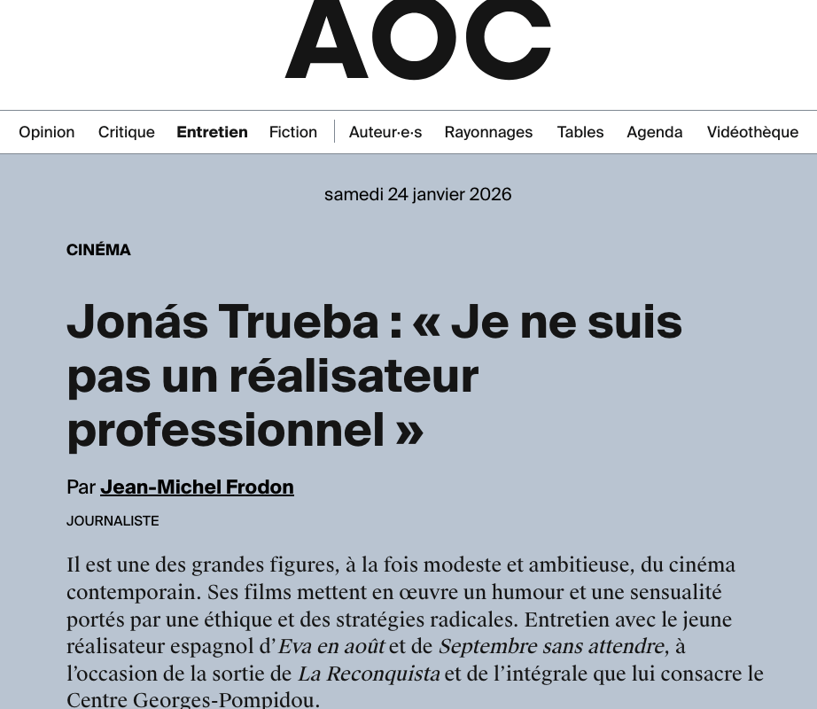 Cinéaste singulier mais dont le travail repose sur une approche collective au long cours, le réalisateur espagnol qui a été découvert en France en 2019 grâce à son cinquième long métrage, Eva en août est notamment l’auteur du récent Septembre sans attendre sorti l’automne dernier. Signataire d’un ensemble de films qui accompagnent avec sincérité et humour sa propre évolution tout en renouvelant les potentialités du langage cinématographique avec une grande créativité formelle, il a tourné pour le programme du Centre Pompidou plusieurs nouveaux titres. Il revient ici sur son cheminement, et sur l’étape majeure qu’est La Reconquista dans ce parcours. Entre autres parce que l’interprète de la jeune femme dans le film, Itsaso Arana, devient alors la partenaire de création de la quasi-totalité des films suivants de Trueba, comme actrice et comme coscénariste.