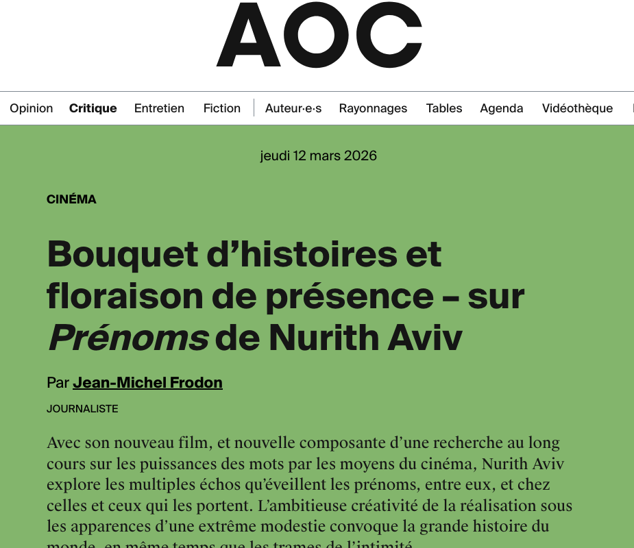 Avec son nouveau film, et nouvelle composante d’une recherche au long cours sur les puissances des mots par les moyens du cinéma, Nurith Aviv explore les multiples échos qu’éveillent les prénoms, entre eux, et chez celles et ceux qui les portent. L’ambitieuse créativité de la réalisation sous les apparences d’une extrême modestie convoque la grande histoire du monde, en même temps que les trames de l’intimité.