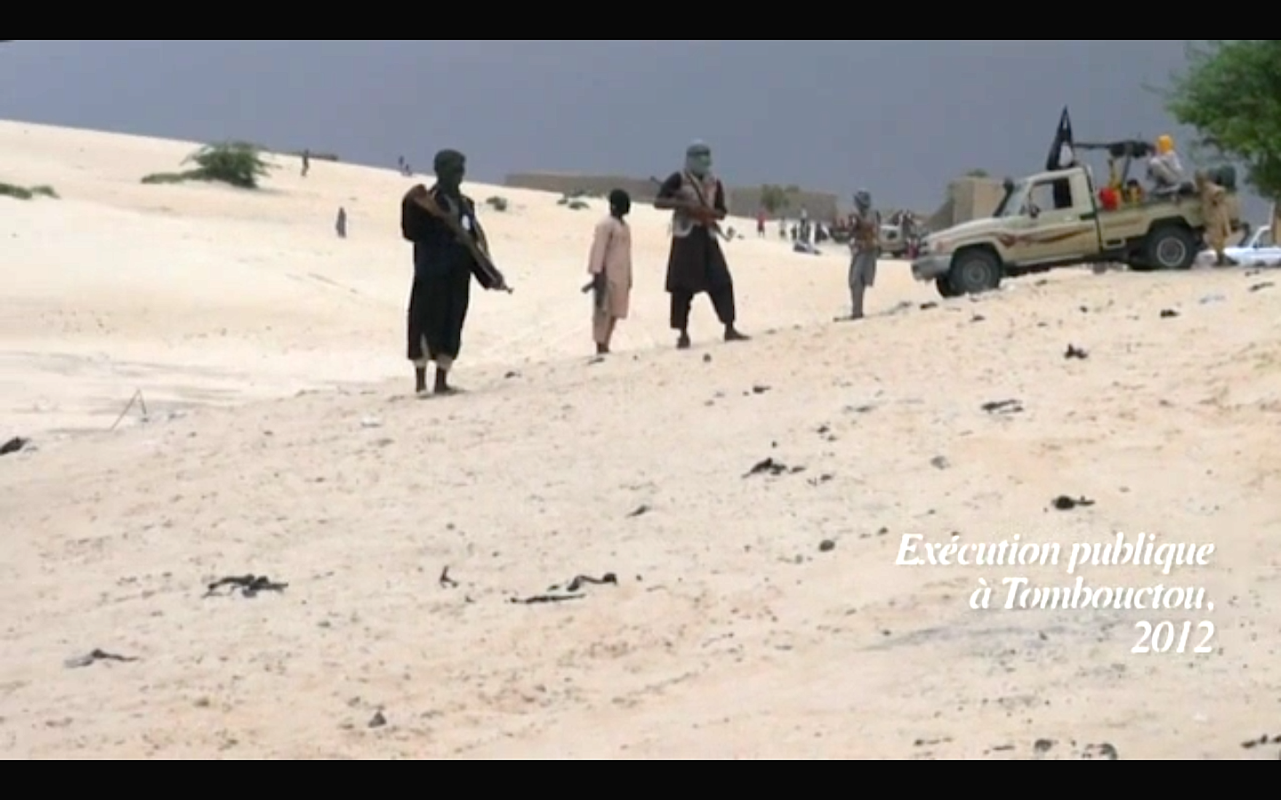 Cette proximité entre Timbuktu et Salafistes n’est pas fortuite: la vidéo, trouvée sur un combattant islamiste au Mali, a inspiré le réalisateur du film de fiction. Surtout, Sissako avait à l’origine envisagé de réaliser un documentaire, et demandé à Lemine Ould Salem, qui pouvait y avoir accès, de se rendre dans Tombouctou et Gao soumis à la loi islamique. Ce sont les images alors tournées qui occupent l’essentiel du début du film, des images enregistrées sous le contrôle des organisations djihadistes, et émaillées d’entretiens avec leurs responsables. Y figure en particulier l’exécution (non montrée à l’écran) d’un Touareg qui a tué un pêcheur noir, soit la péripétie principale autour de laquelle sera construite Timbuktu.