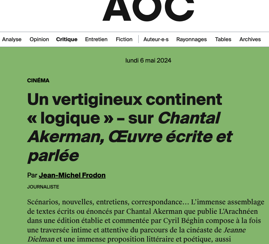 Cet ensemble vient ainsi compléter la rétrospective en salles de l’automne dernier, l’exposition magnifique qui s’était tenue au Musée du Jeu de paume, et un considérable travail d’édition imprimée, dont la réunion de L’Œuvre écrite et parlée de Chantal Akerman mise en forme par Cyril Béghin chez L’Arachnéen.