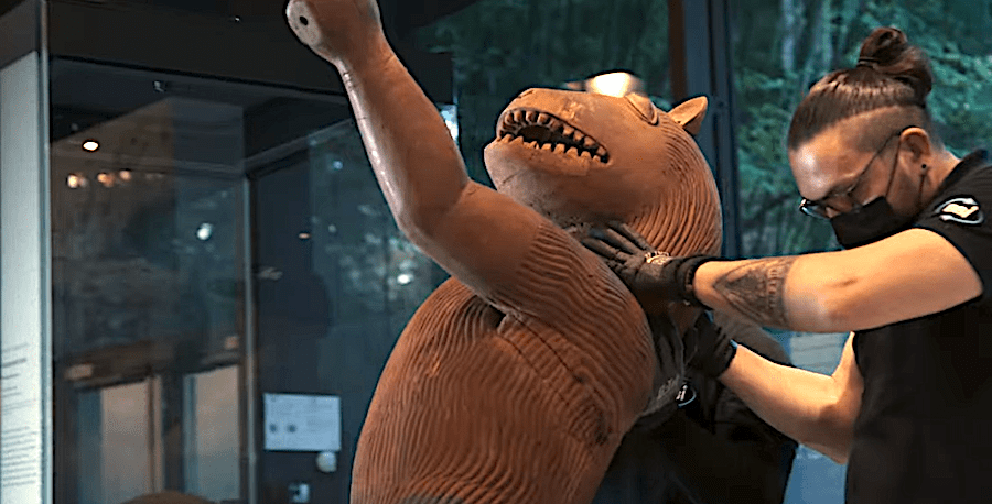 La statue du roi Glélé lors de sa mise en caisse au Musée du Quai Branly.